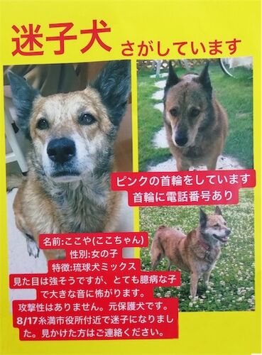 ことし2019年8月17日の夜。 糸満市で花火が上がりました。 「第31回糸満ふるさと祭り」初日の終わりを告げる花火です。この大きな音に驚いて、「ここ」という名前の1匹の飼い犬が逃げ出してしまいました。 場所は糸満市役所付近。 (Google Maps) もちろん、…